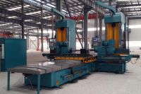 數(shù)控五軸雙立柱鏜床為臥式雙面布置,主要適合加工對稱度要求高的孔的鏜削加工。并能附帶高速銑削、 低速銑削、鉆孔等功能。工件放在專用移動工作臺上,左右分別兩個立柱帶可橫向移動的滑臺,滑臺上放動力頭。移動工作臺、橫進(jìn)滑臺及立柱滑臺由數(shù)控系統(tǒng)控制,主軸轉(zhuǎn)速通過變頻器調(diào)速。該機(jī)床由一套五軸數(shù)控系統(tǒng)控制,配備兩套懸掛式控制箱,并配可持式手脈。機(jī)床配有獨(dú)立的液壓站,能夠?qū)崿F(xiàn)立柱滑臺的自動鎖緊。運(yùn)動部分采用滾珠絲杠連接。機(jī)床配有獨(dú)立的電器柜,并有風(fēng)冷裝置。